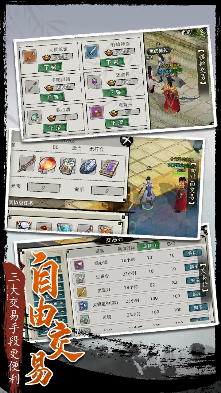 游戏拥有面对面交易,摆摊交易,交易行交易三大交易系统,全面放开游戏交易,同时有些内一切物品道具,充值币都会进行掉落