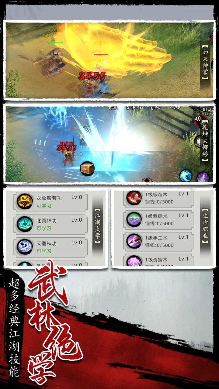 人物技能除了本身职业技能每个职业16个外,还有江湖武学技能10种,涵盖武侠小说中各类经典功法武学