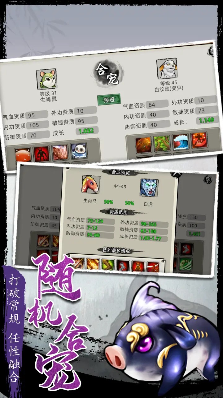 游戏内一切宠物都可相互合宠融合,打破一切规则,每只宠物在合宠时都有几率突破资质上限,成为超级宝宝,合宠还会重新随机技能数量,以此获得更多宠物技能