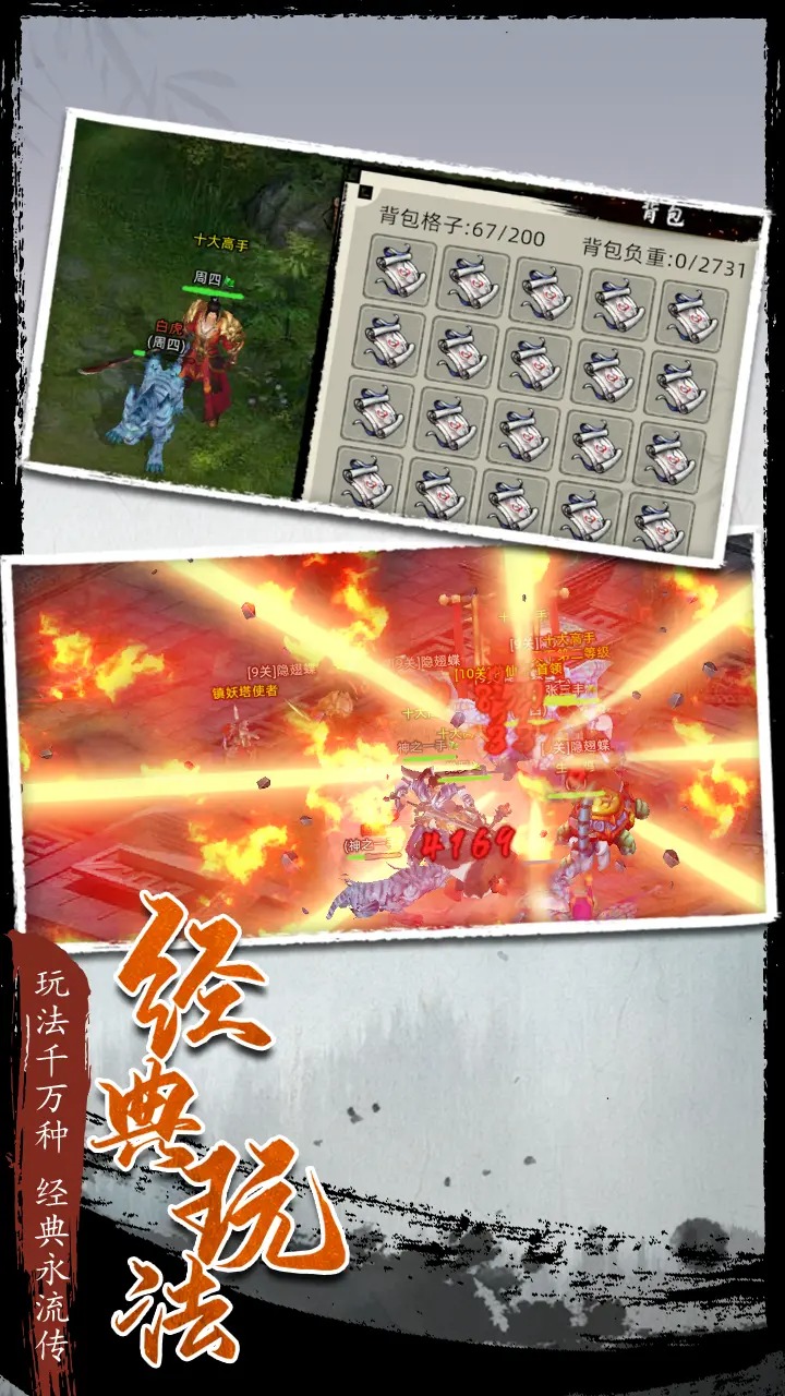 游戏中拥有不少经典玩法,如藏宝图挖宝、降妖除魔,悬赏任务,世界boss,异族刺客,镇妖塔试炼调整,守卫家园塔防玩法等等