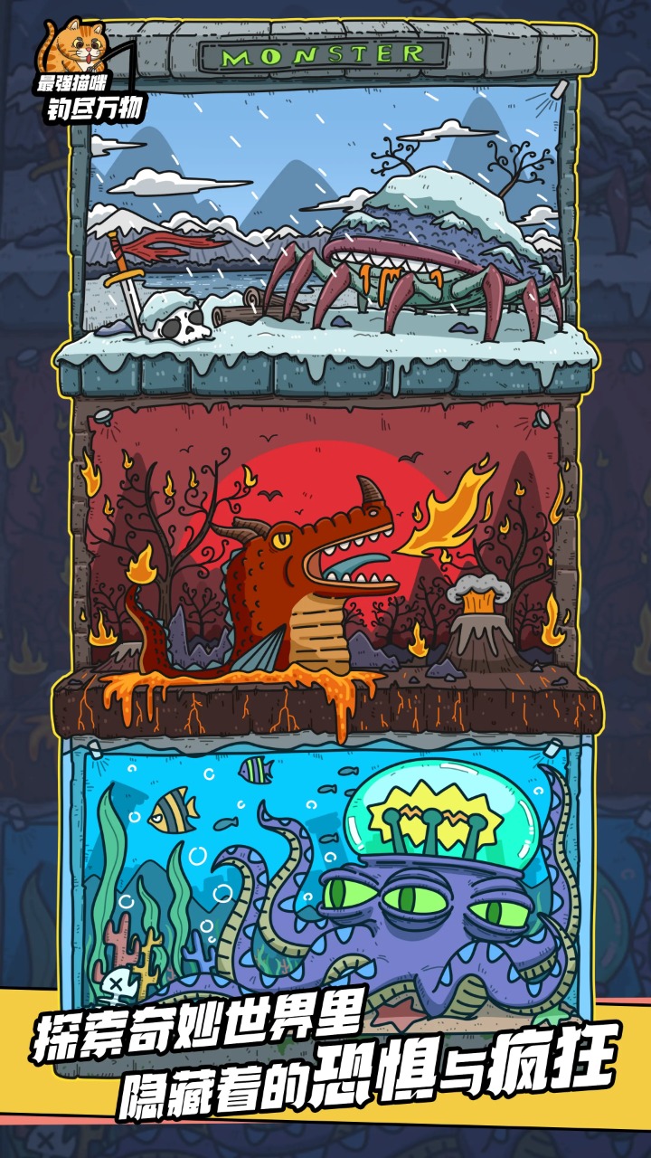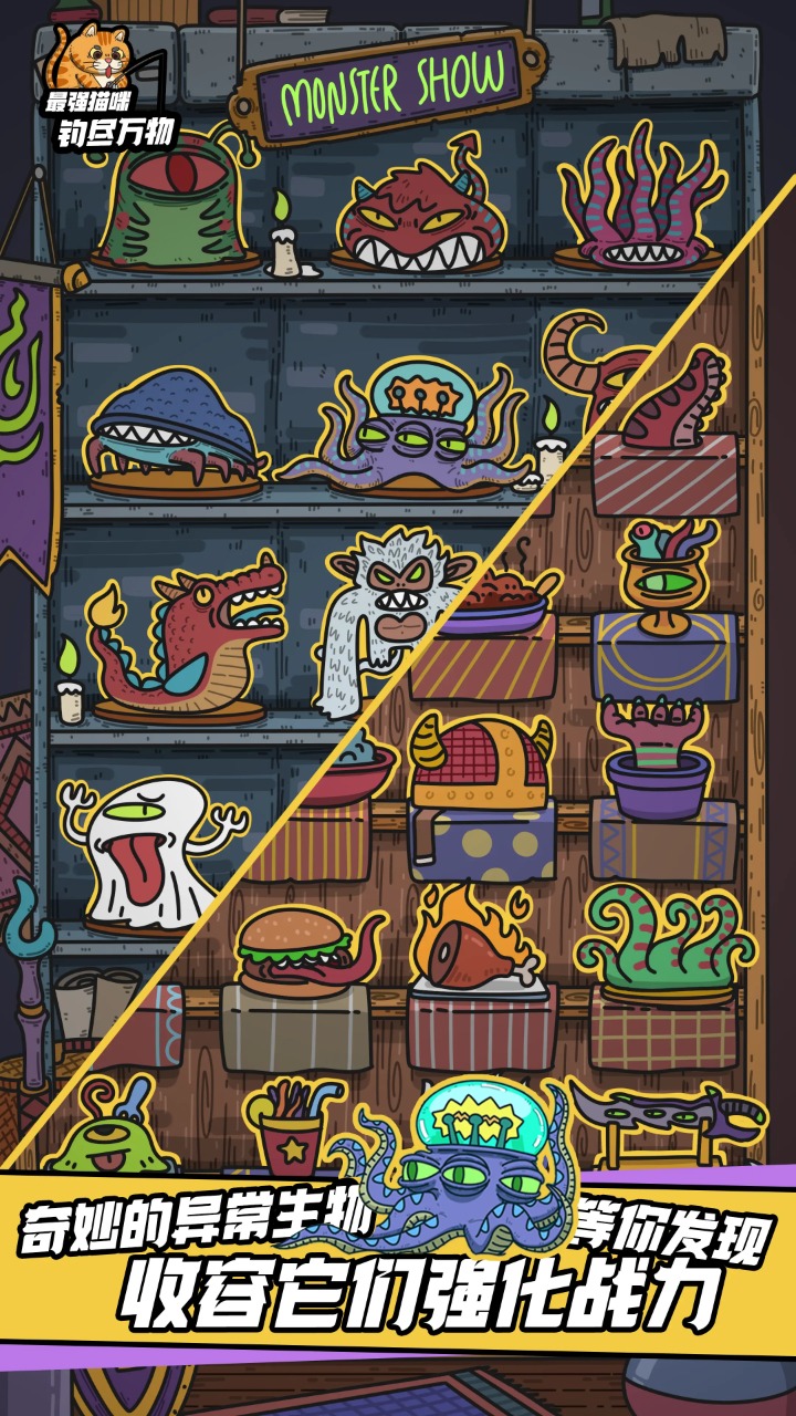 《最强猫咪:钓尽万物》是一款拥有放置元素,画风猎奇搞怪的收集养成手游;在光怪陆离的神秘地域,钓起诡形殊状,奇妙万千的神秘生物;装备制造, 图鉴收集,把它们和用它们制造出来的道具,展示到你的收藏柜里!放置挂机,持续变强,冲垮这个世界!