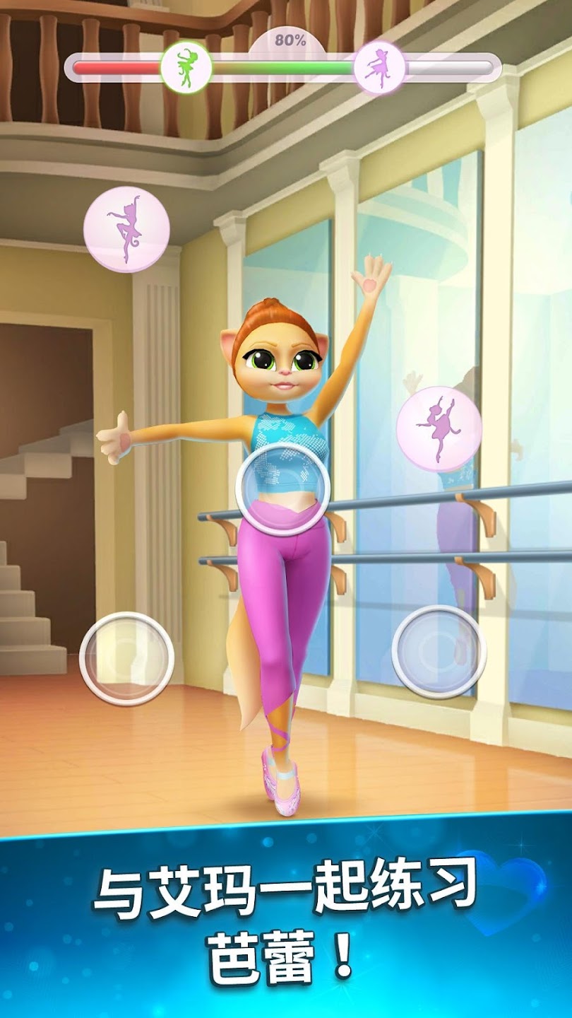 您能胜任照顾这只虚拟宠物的任务吗?每日喂食和哄她睡觉,在她发生意外时带她去看医生,让这只会说话的猫健康幸福地生长。会说话的艾玛猫 – 芭蕾舞星需要您的帮助,因此不妨下载这款动物游戏,协助她迈向成功。在这款芭蕾舞游戏中,这只虚拟宠物将穿上高雅的芭蕾服装,展现其舞步和芭蕾舞技。您只需要确保这只优雅的会说话的猫出席每一堂芭蕾舞课,并尽享跳舞的乐趣。