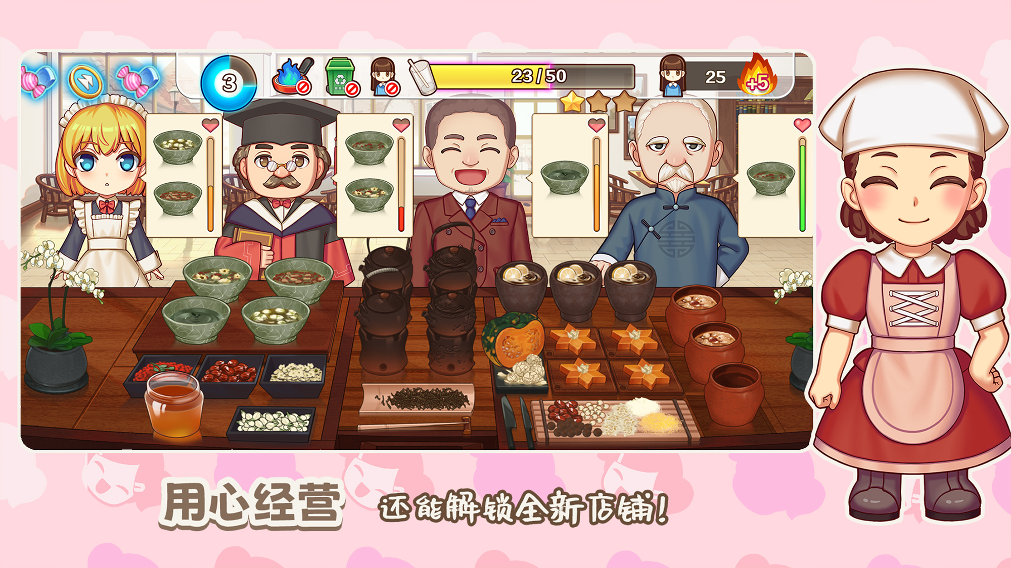 金币的进账,顾客好感度的增加,等级的提升,菜单逐渐的丰富,让你在简单的操作中获得纯粹的快乐!