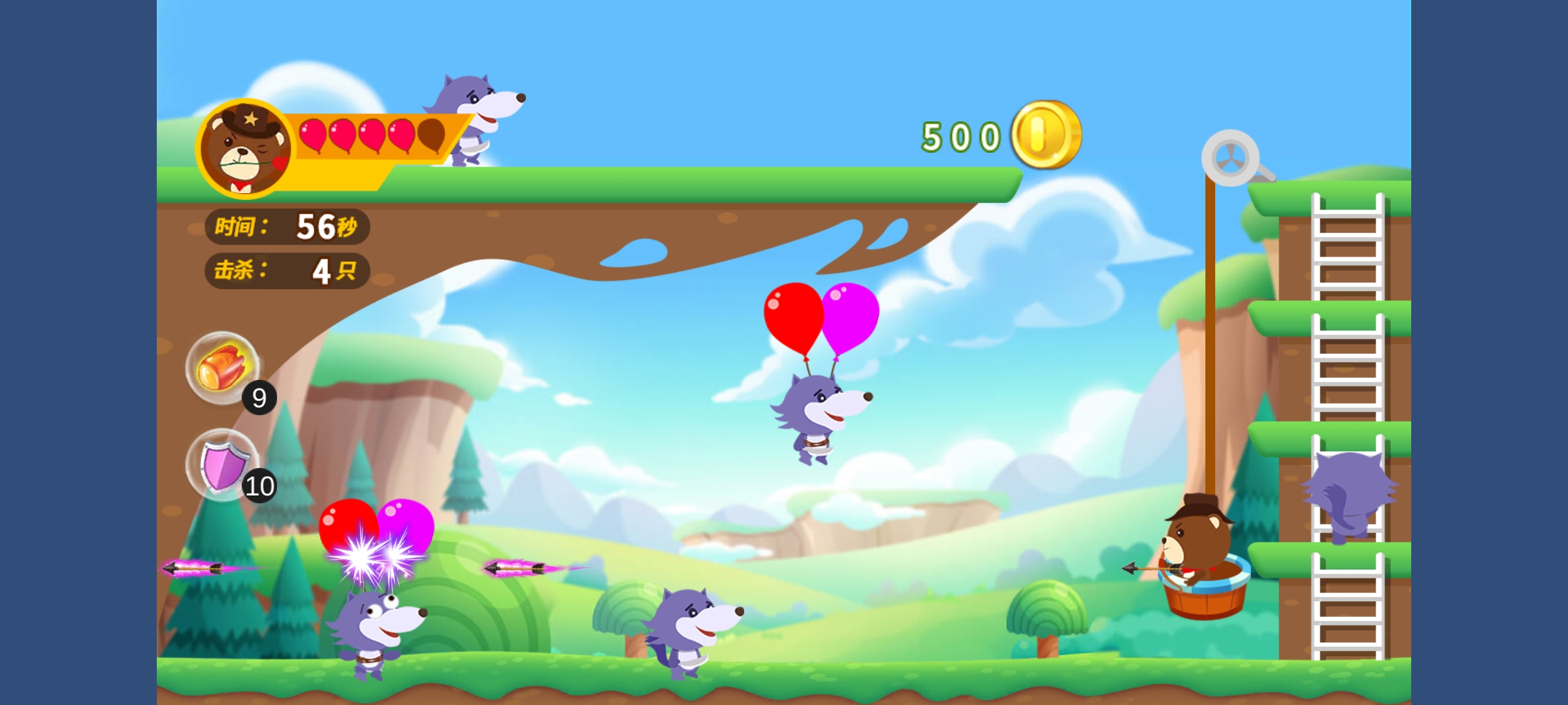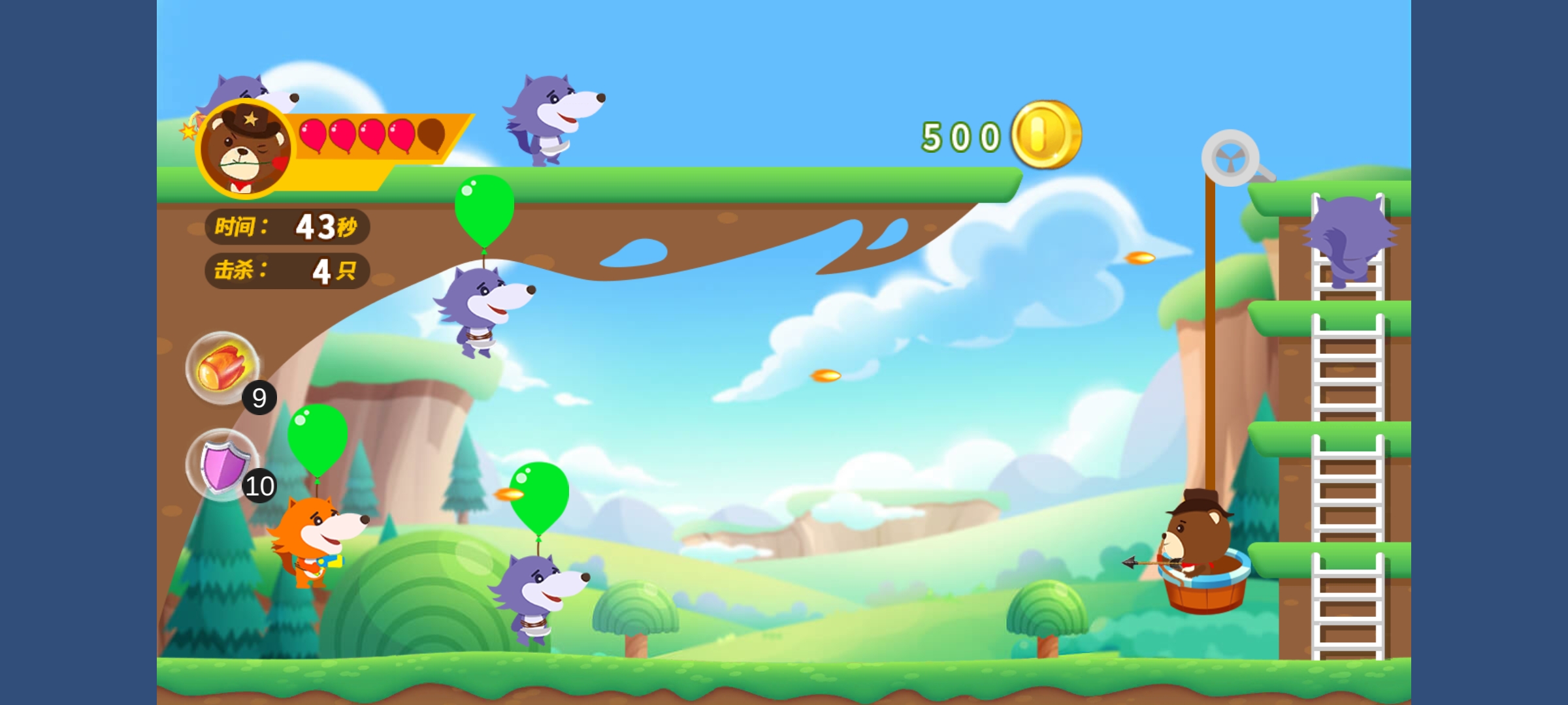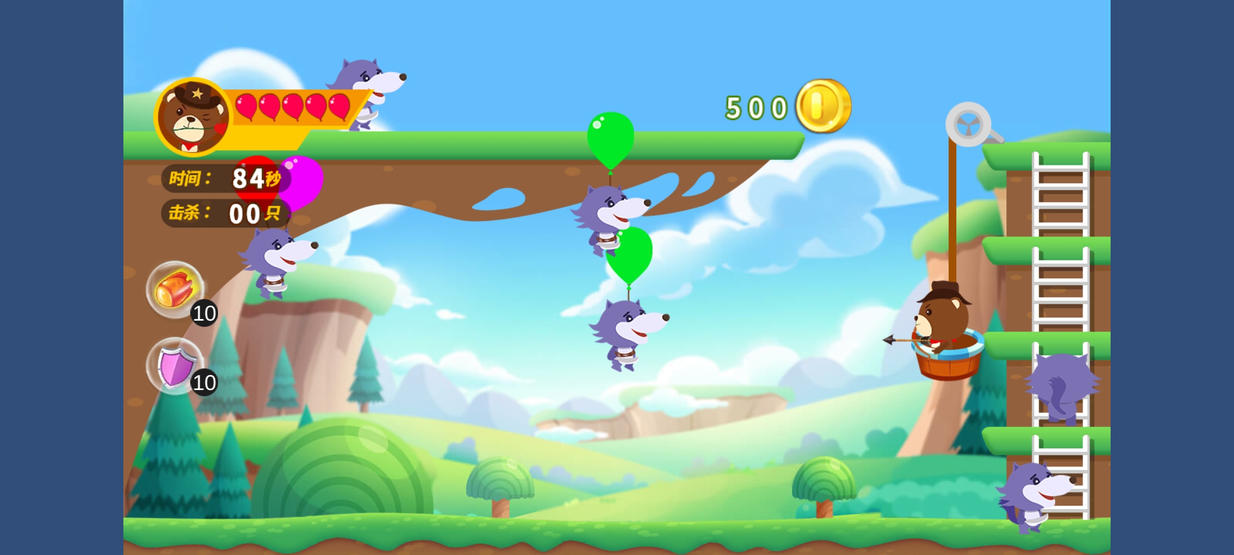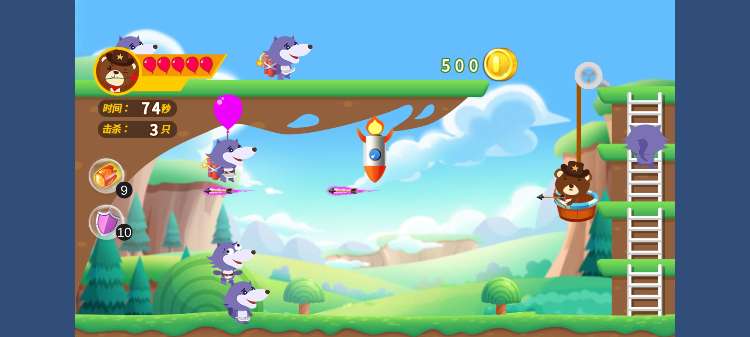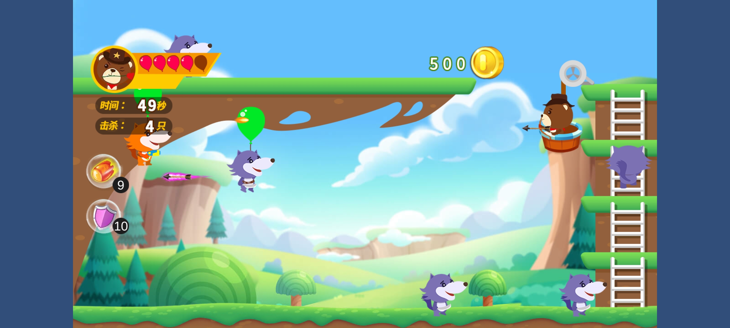 “保卫庄园”是一款动物阻止狼群,侵入庄园的游戏,狼群成规模通过,空投的方式入侵庄园,我们的动物勇士们则使用手中的弓箭阻止它们的入侵。
