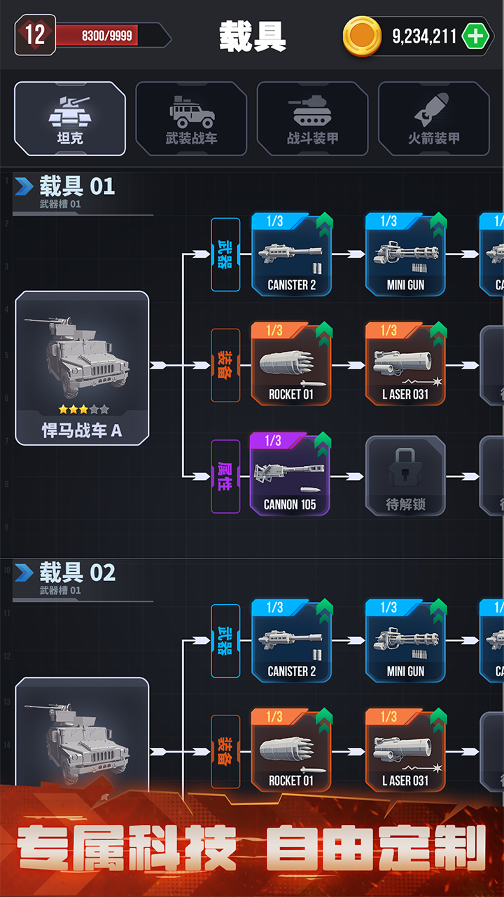 数量丰富、各具特色的装备,任你自由搭配,改装出独一无二的战斗坦克。