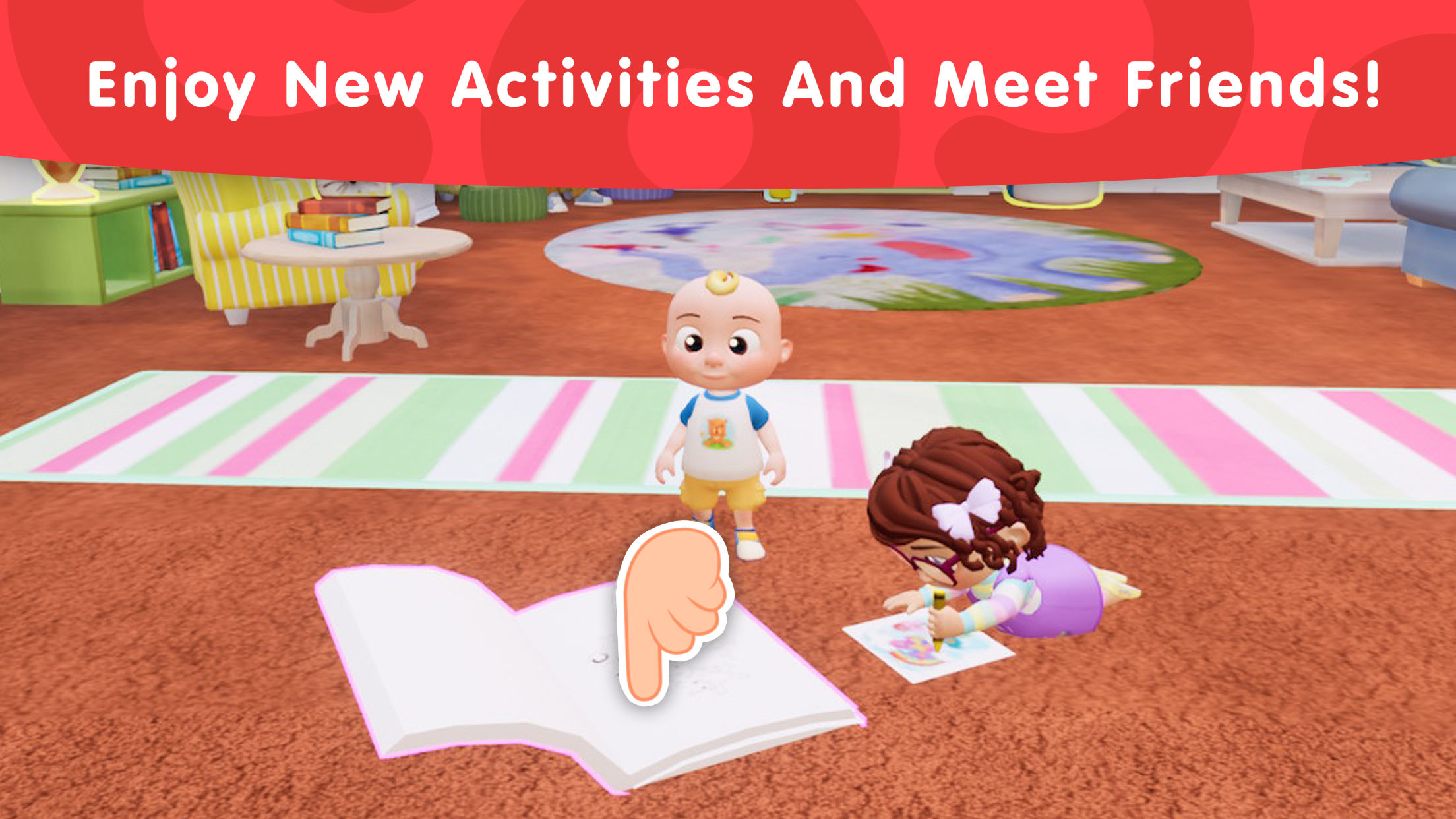 欢迎来到可可瓜儿歌的世界,你和家人受邀来到 JJ 的家里一同玩耍。点击每个房间里的互动物品,即可发现有趣的惊喜,不仅有可供探索的隐藏玩具、可以画的图、可以制作的作品,还能一同欢唱“Wheels on the Bus”和“Yes Yes Vegetables!”等可可瓜儿歌。