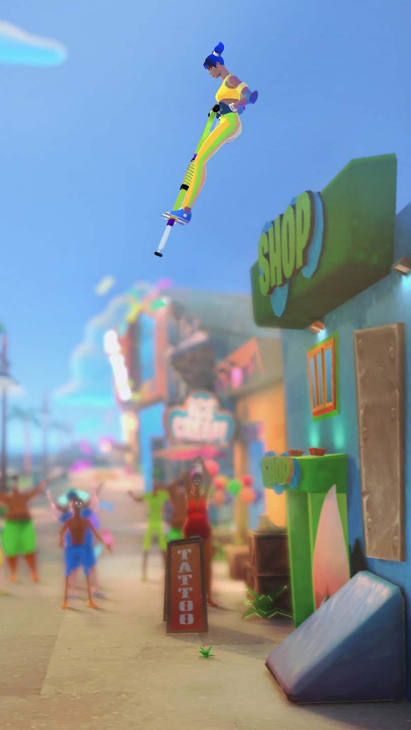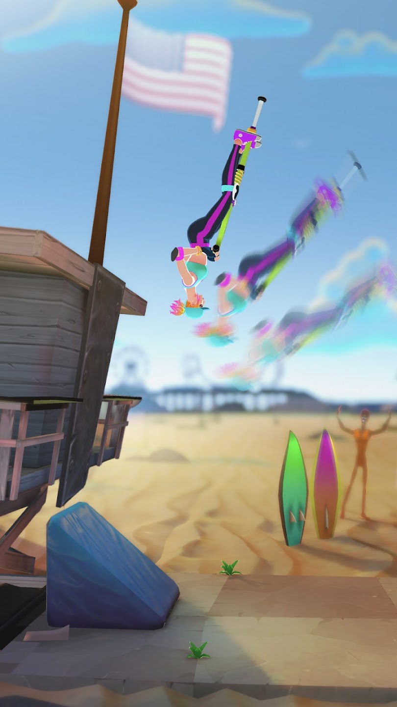 在这个游戏中,你将作为一个跳跃者腾空而起,从惊人的高度执行前空翻、后空翻,甚至更复杂的特技跳跃。您不仅仅是从悬崖和摇摇欲坠的平台上跳下来 - 这个游戏将带您穿越多个地点,从阳光明媚的海滩到沙砾的街道,甚至在高高的树上!