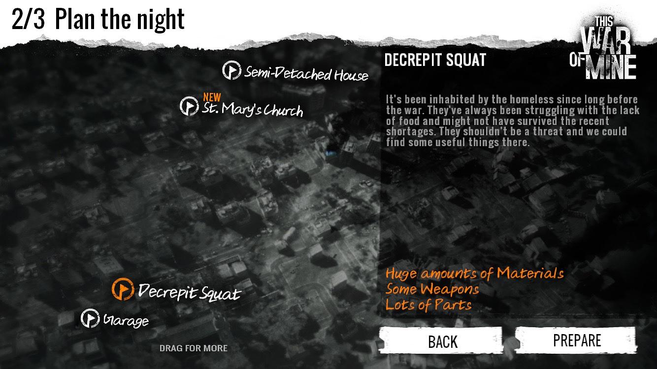 《这是我的战争》的游戏步调由昼夜更替设定。白天,外面的狙击手迫使你留在屋内,这期间你需要好好经营藏身处。你可以制作、交易物品以及照顾幸存者。晚上,你得派一个平民前往一系列特殊地点收集大伙儿生存必需的物资。