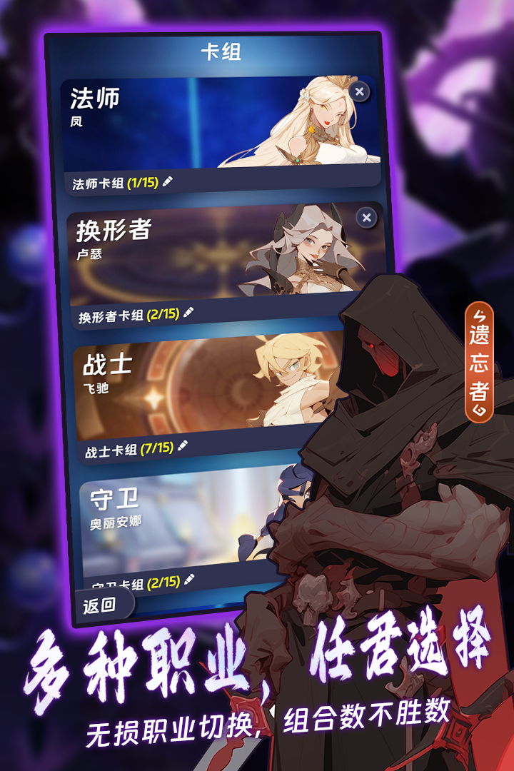 四个职业与约两百张卡牌为你提供了丰富的战斗选择。快攻、中速、控制、爆牌、直伤、加成……诸多玩法等待你去发掘,打造出属于自己的最强战术。