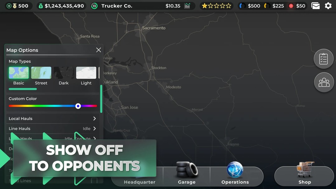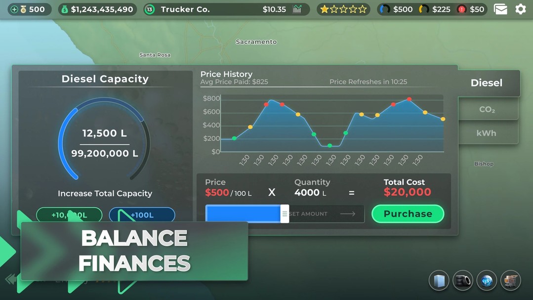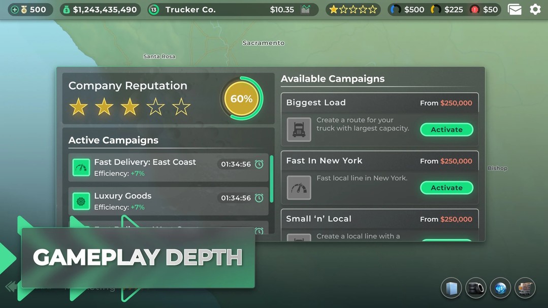 两种游戏模式可供选择:简单模式和现实模式。从你的旅程开始,走简单的大亨之路,降低价格并增加利润,或者用现实主义模拟游戏挑战自己,在其中你必须考虑最小的事情,例如卡车上的车轮数量。