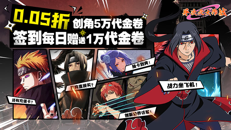 【异次元大作战(0.05折百万代金版)】是一款正版横版火影卡牌游戏!游戏内真实还原了旋涡鸣人一路成长的历程,一路挑战各个关卡,收入各个动漫里面脍炙人口的人物作为自己的伙伴,一起征战忍界!新版百万代金版本强势来袭,上线就送5万代金券+神话忍者自选*6,直接成就神话小队;游戏内还有波风天人等四个本游戏自创万能忍者,阵容搭配更加灵活。各种PVP、PVE等玩法,让手指根本停不下来,这个火影手游很有意思,快来加入我们吧!