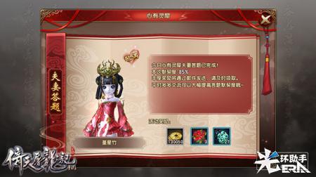 婚姻系统中新增了心有灵犀夫妻双人答题玩法,算是考验双方默契程度的一个小游戏吧。成为夫妻的双方只要在大都找到颜如玉即可触发该活动。活动中,两人都需要依次回答20道问题,只要双方选择的答案相同,即算“心有灵犀”。在完成活动之后,夫妻二人都可以获得按照最终的默契程度获取数量不等的铜币、鲜花和鸳鸯佩,其中鸳鸯佩可以用来兑换一些夫妻专用的的爱情信物噢,嘿嘿,所以这活动不仅可以培养感情,还是可以顺便赚点福利的啦。