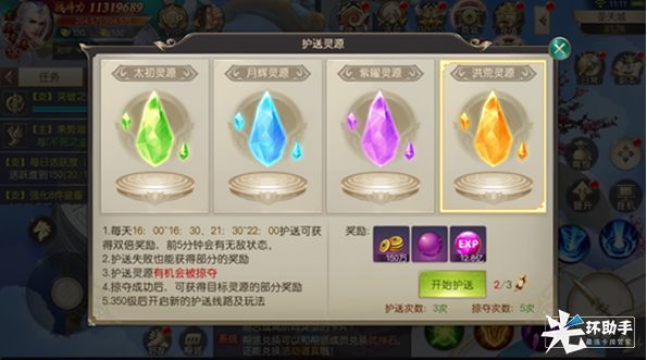 (1)跨服护送灵源,每日16:00-16:30,21:30-22:00双倍护送奖励时间,每日可护送3次,可掠夺5次,掠夺成功才计算次数,单次护送最长时间为10分钟,前5分钟为安全时间无法掠夺。护送成功能获得大奖的铜钱、经验、以及“法身成长丹”。