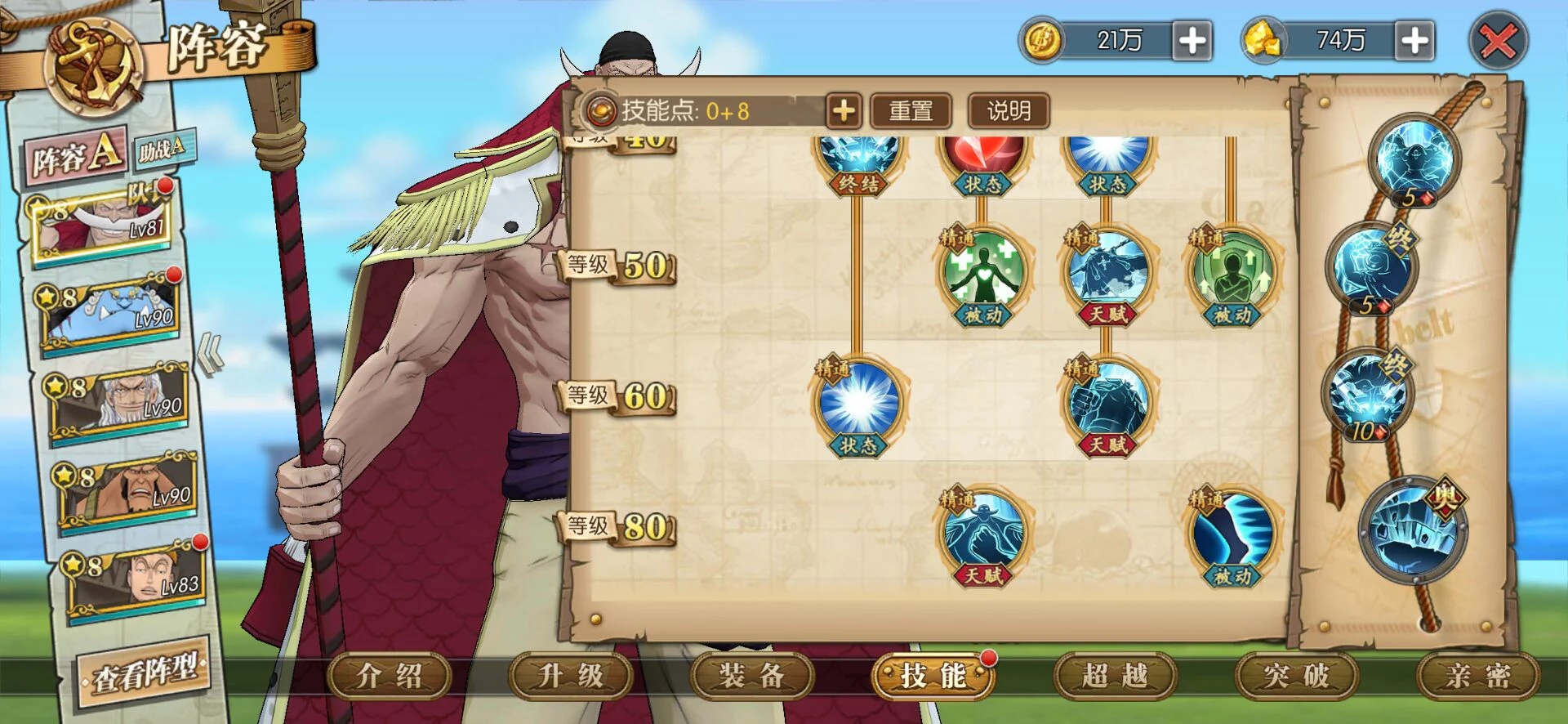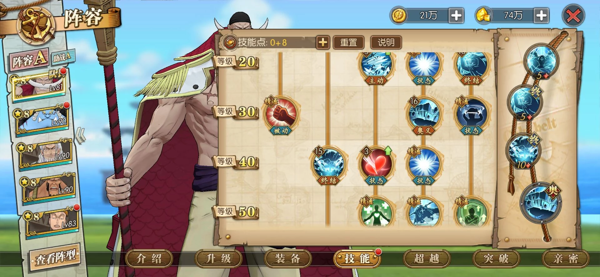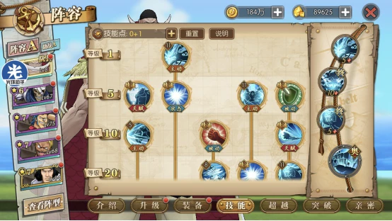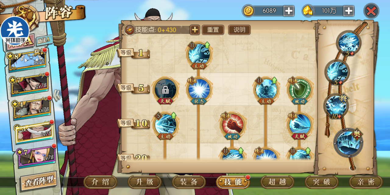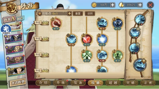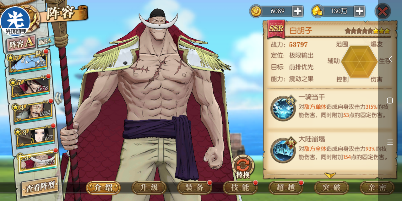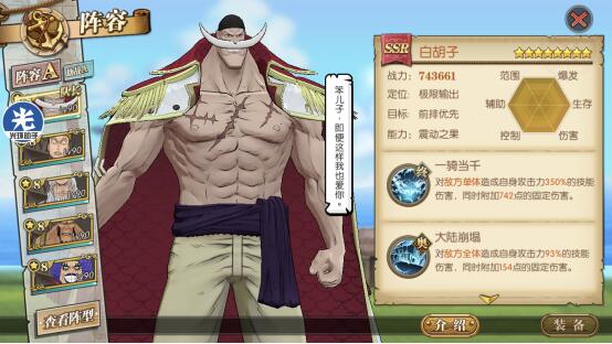 这套就是目前高分天梯用的最多的技能套路了,可以选择开局一骑当千必秒一个或者坏天海震+奥义,因为白胡子每回合都是十混可以一直奥义,平民也适用这套,要过主线我建议你换那个斩断技能
