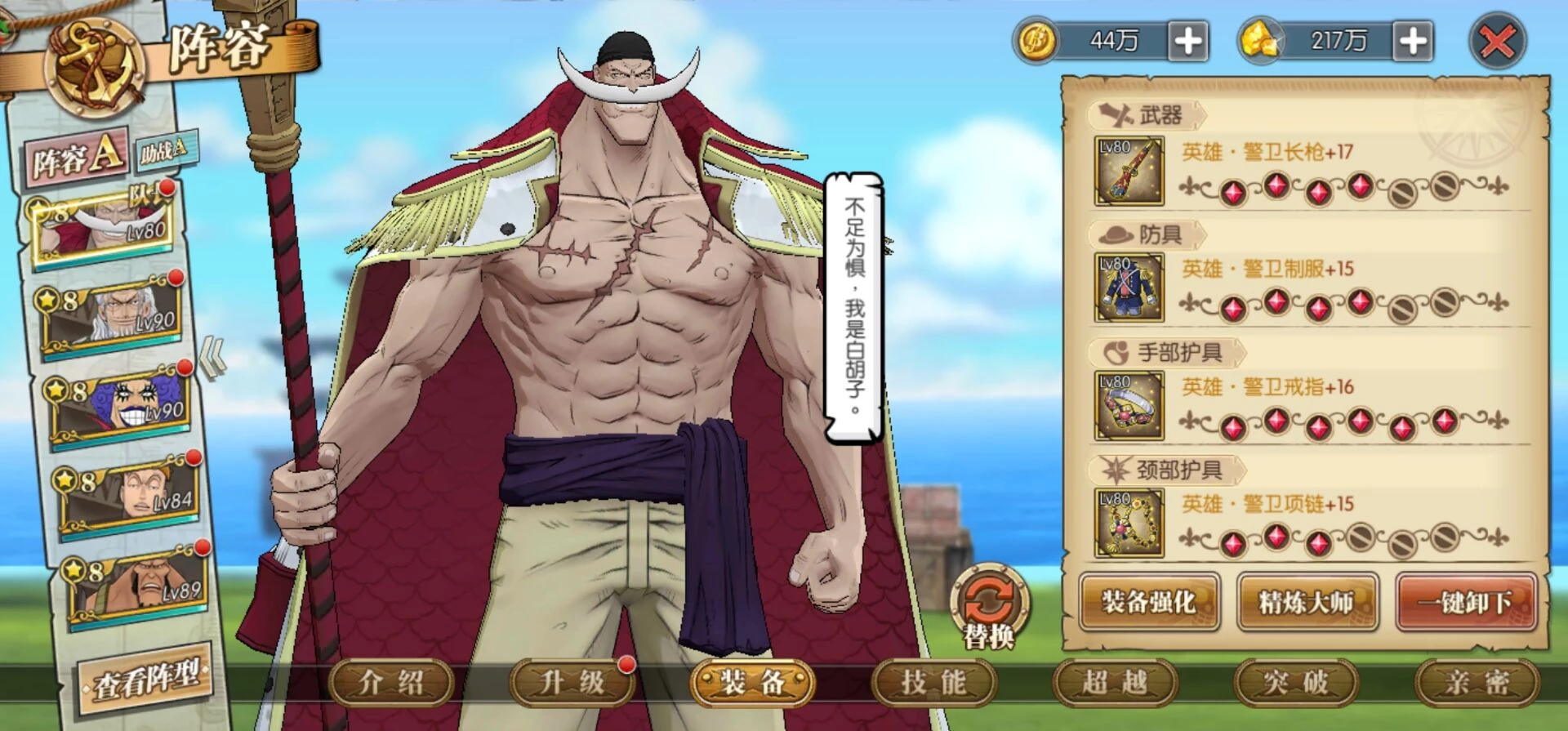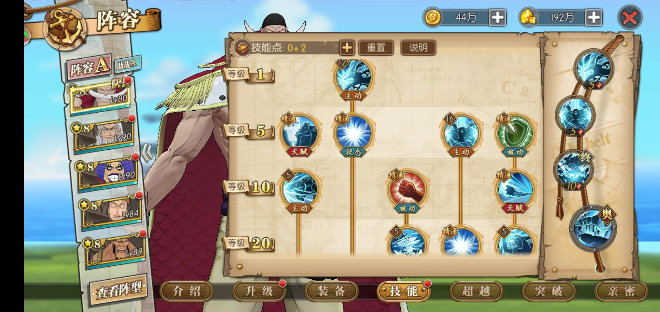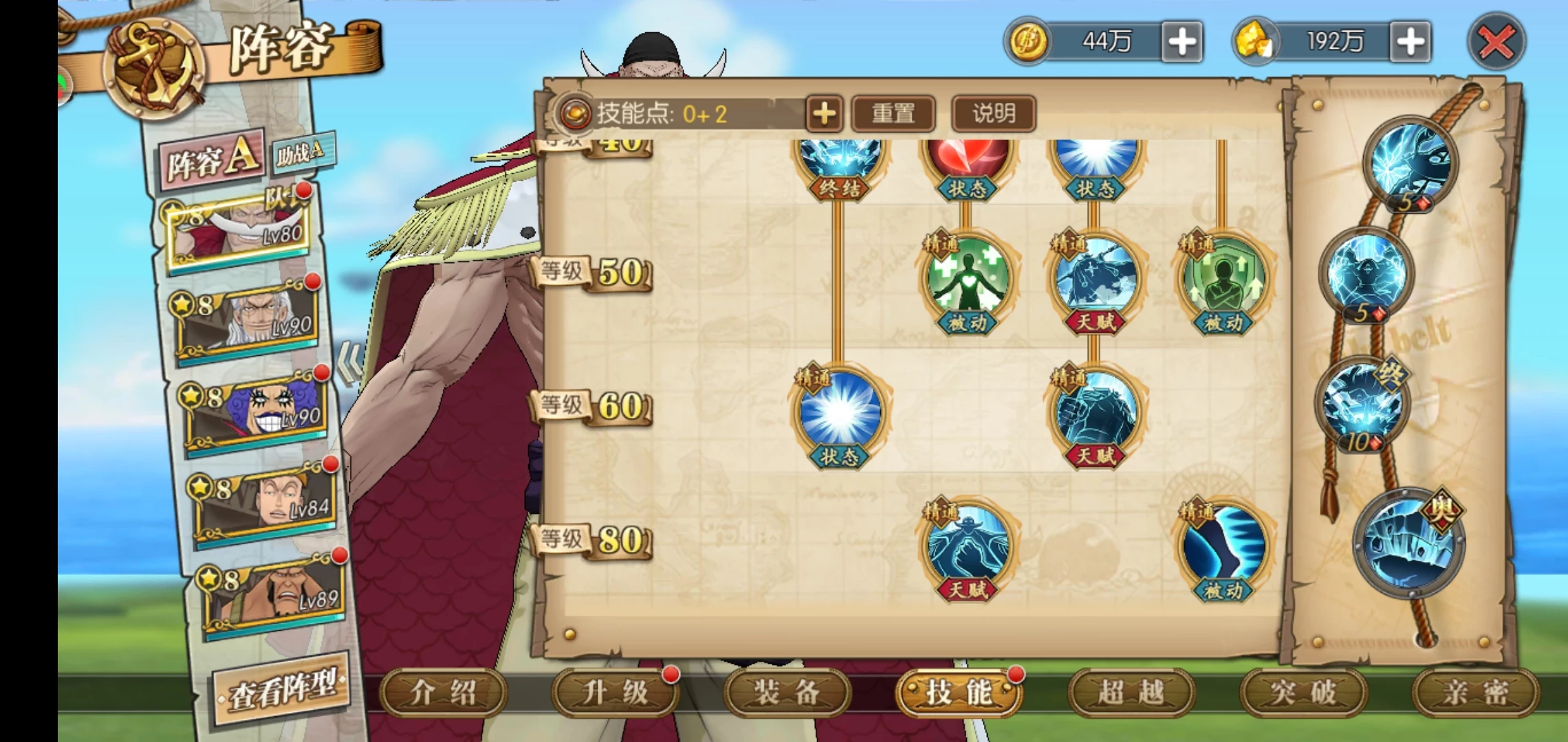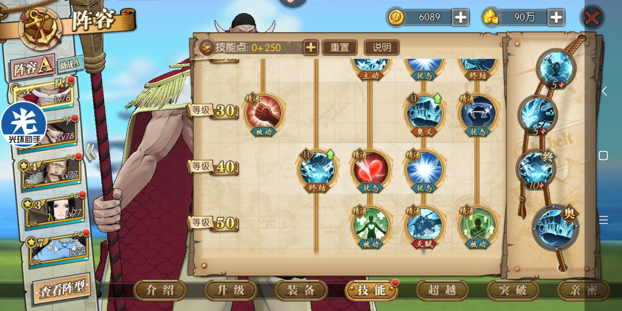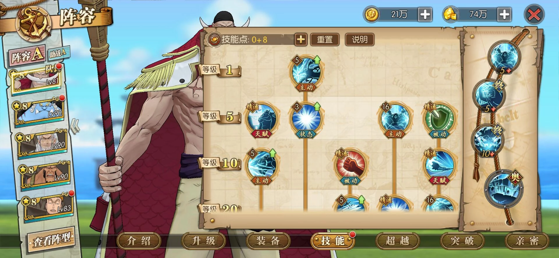 这套就是目前高分天梯用的最多的技能套路了,可以选择开局一骑当千必秒一个或者坏天海震+奥义,因为白胡子每回合都是十混可以一直奥义,平民也适用这套,要过主线我建议你换那个斩断技能