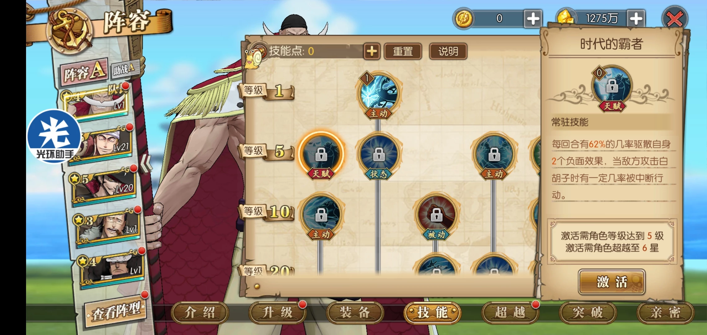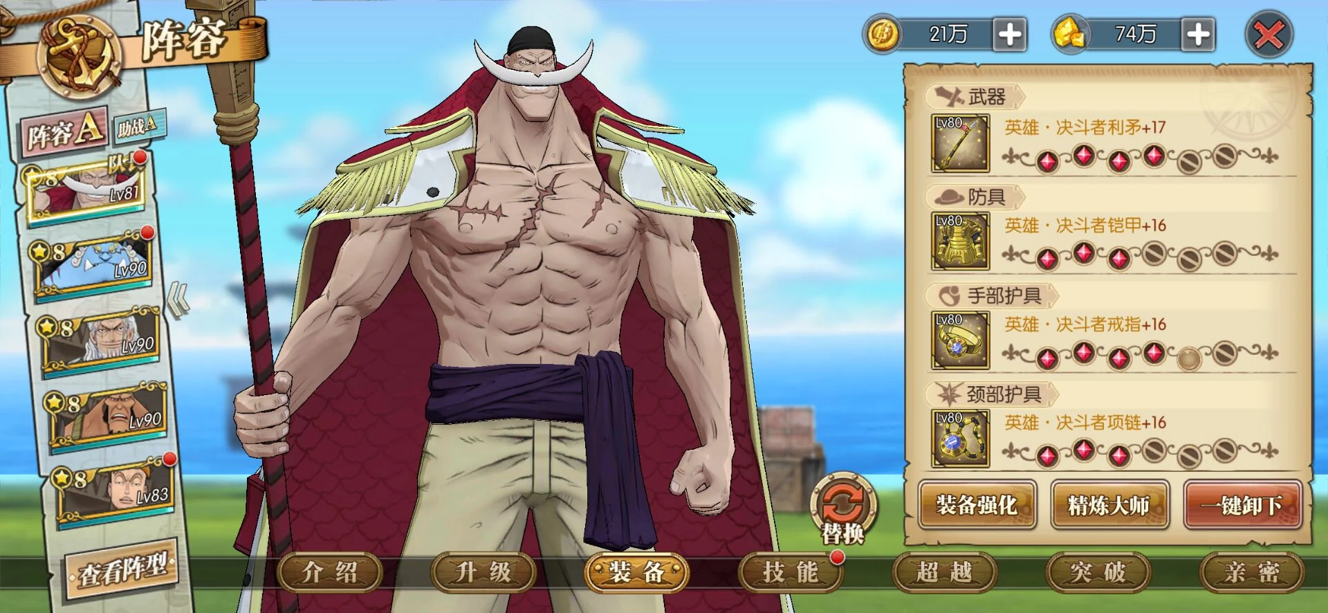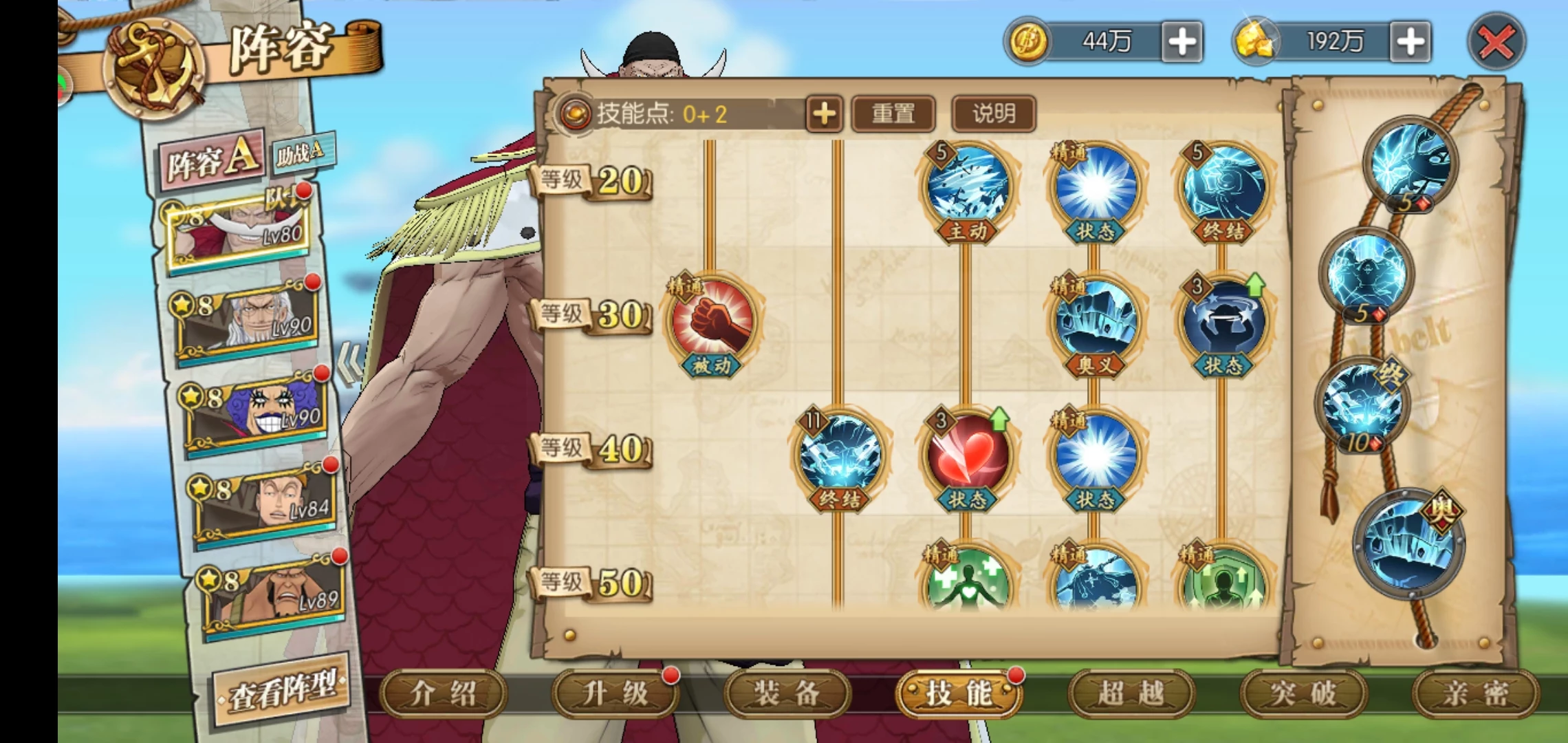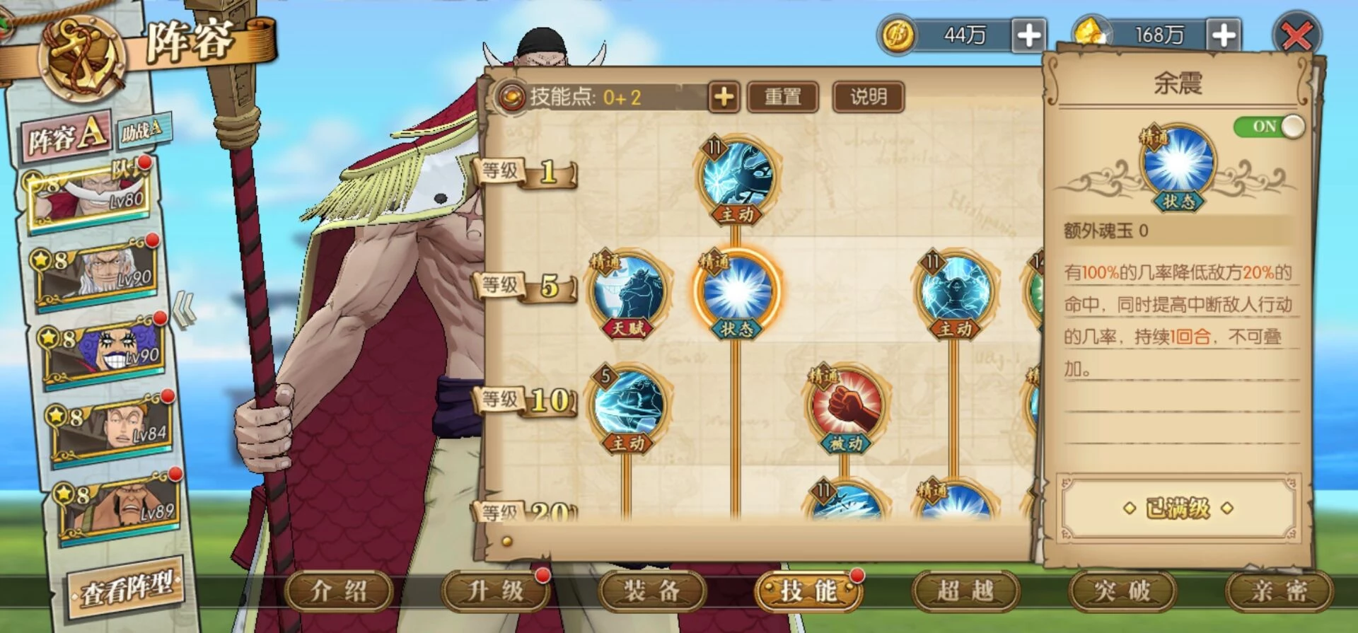 这套就是目前高分天梯用的最多的技能套路了,可以选择开局一骑当千必秒一个或者坏天海震+奥义,因为白胡子每回合都是十混可以一直奥义,平民也适用这套,要过主线我建议你换那个斩断技能