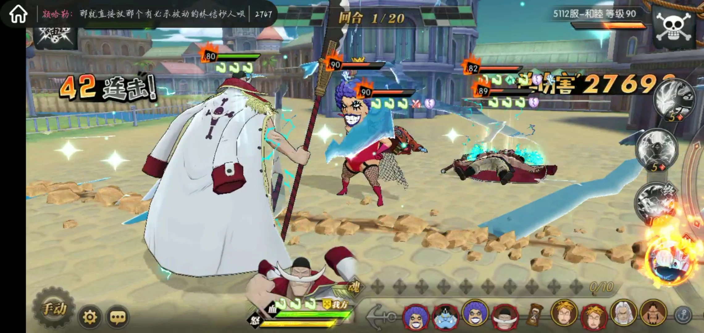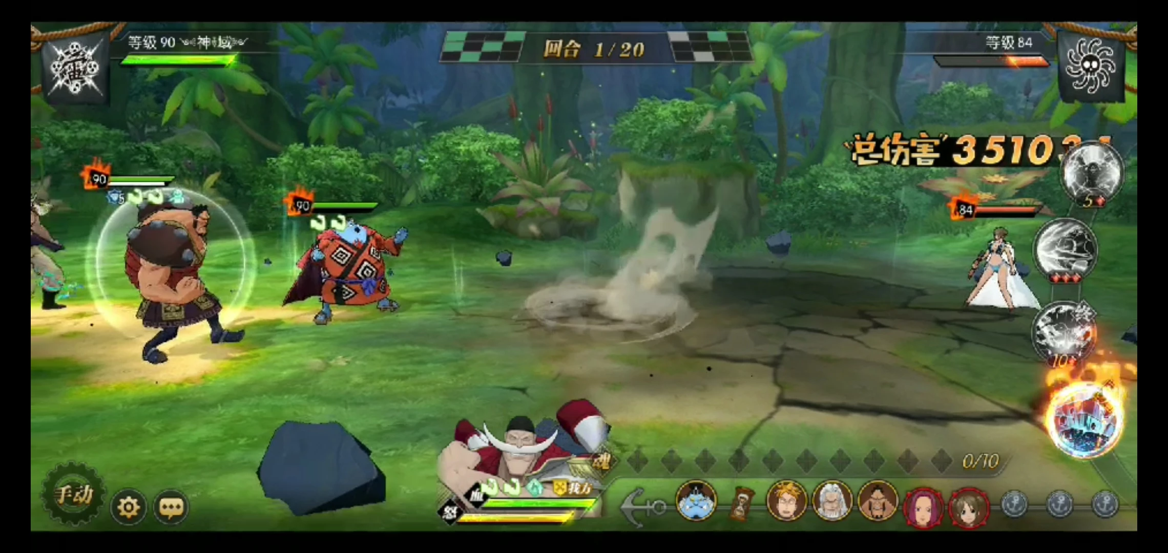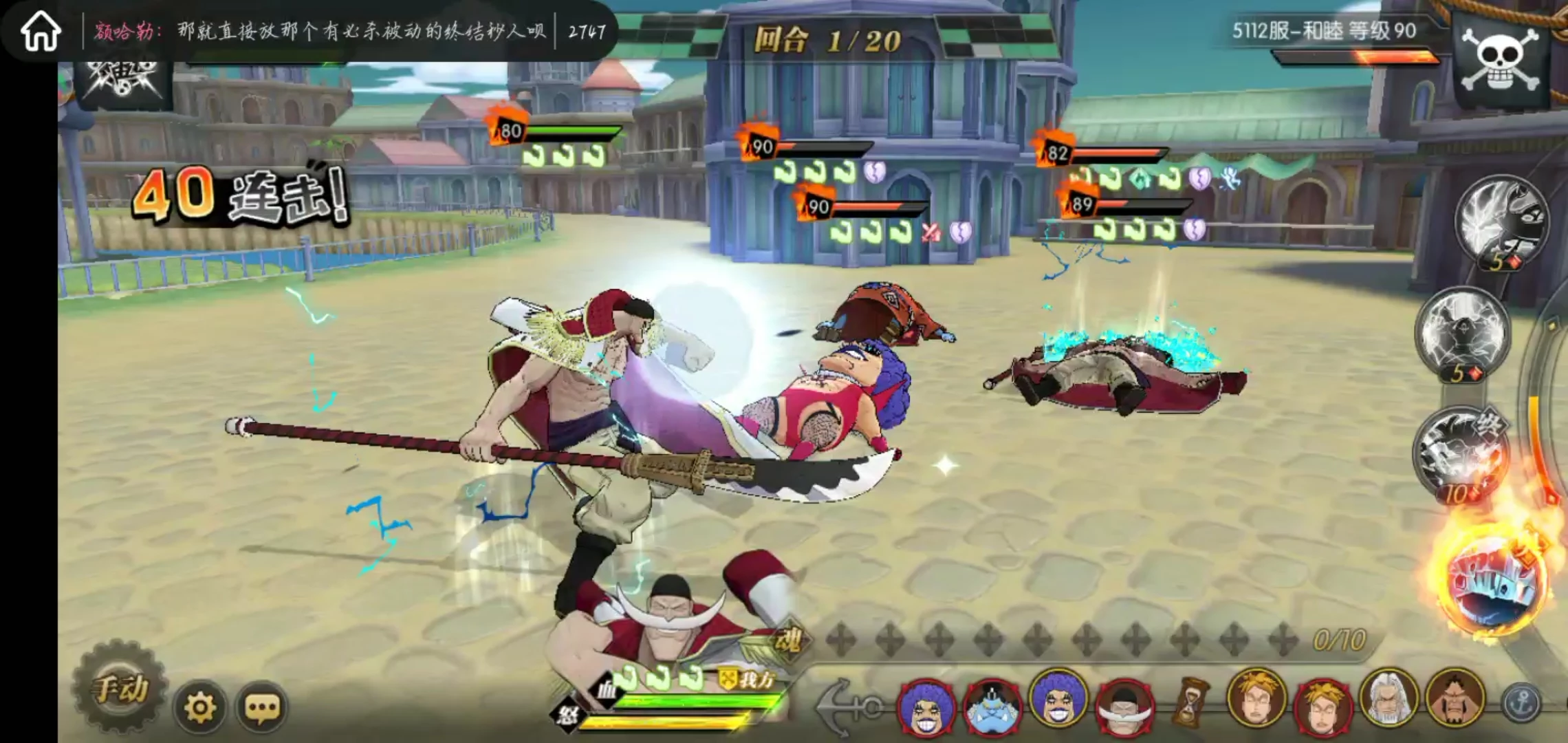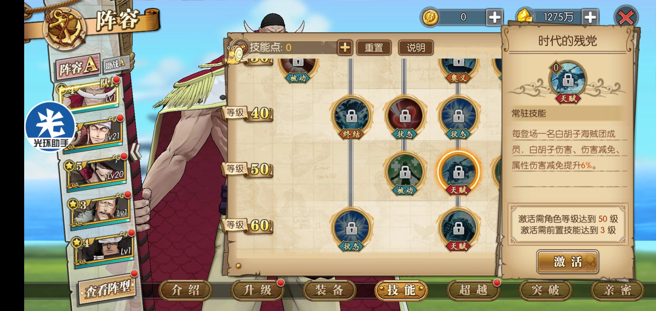 这套就是目前高分天梯用的最多的技能套路了,可以选择开局一骑当千必秒一个或者坏天海震+奥义,因为白胡子每回合都是十混可以一直奥义,平民也适用这套,要过主线我建议你换那个斩断技能
