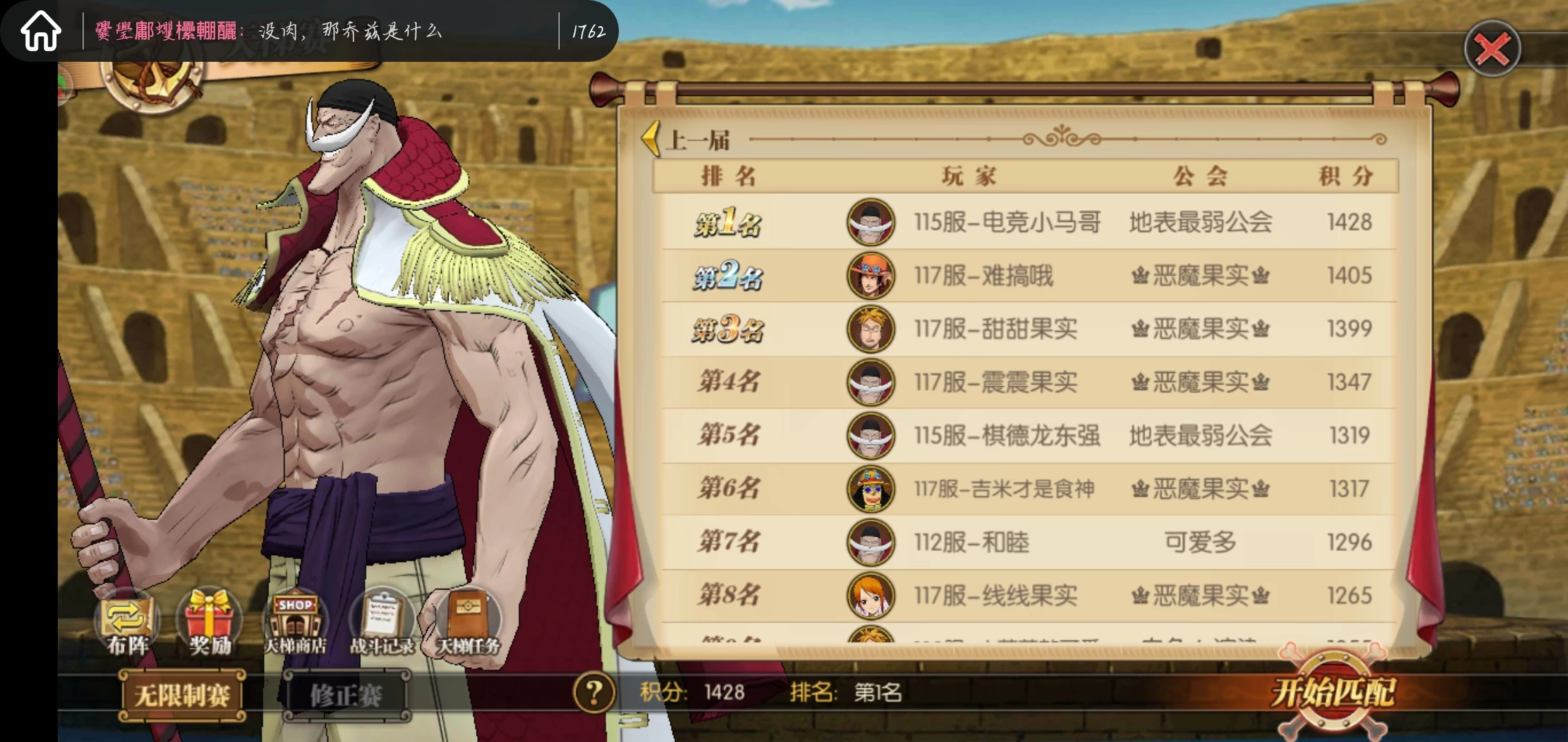 最强四皇一定要有排名,时代的霸者有概率让对手自动退回,实测敌方平a技能都可能触发,大概效果就是敌方平a之后如果触发你白胡子会自动碎屏一次然后敌方无法释放技能和奥义停手撤退