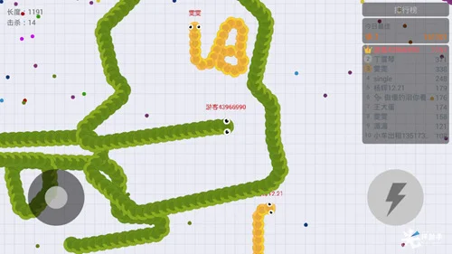游戏操作非常简单,玩家只需控制左下方的虚拟摇杆移动来吞噬食物以变得更大更长(邪恶脸)。冲刺按钮可以加速前行以截击敌人。右上方还有小地图为玩家指引方向,可谓是傻瓜化的操作。