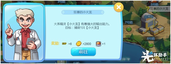 5.接着,跟着 捕捉任务 ,捕捉【小火龙】。小火龙是一个很强大的输出,值得培养。