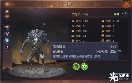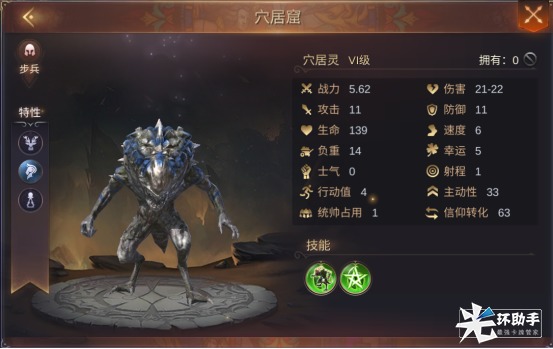 穴居灵是地下城种族的初级兵种,也是各位领主大人进入游戏后可以立刻获得的兵种。穴居灵作为步兵兵种,其防御和生命都比较高,是游戏前期比较优秀的前排兵种。