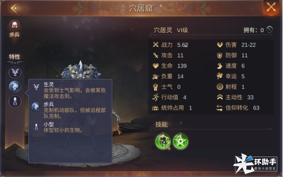 穴居灵拥有以下4种特性,分别是生灵,步兵,小型这三种。