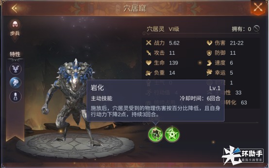 岩化是主动技能,冷却时间为6回合。施放后,穴居灵受到的物理伤害按百分比降低,且自身行动力下降2点,持续3回合。该技能有效提升了穴居灵的肉度,是优秀的坦克技能。但是值得注意的是,开启后会下降自身的行动力。各位领主大人一定要掌握好释放的时机哦。