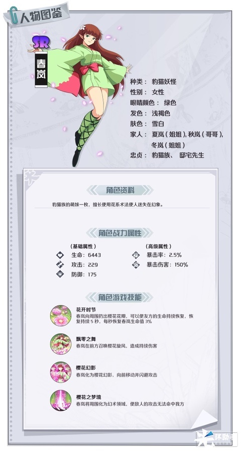 妹妹春岚擅长幻影之术,能借助樱花幻化出无数幻影,而她则躲在幻影后,看着那些愚蠢的敌人拼命砍杀着假的幻影