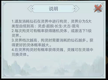 每次拘灵需要耗费仙石,可以随机获取不同的灵体,也能获取灵魄,用于兑换高级灵体或灵体经验,在灵境中查看