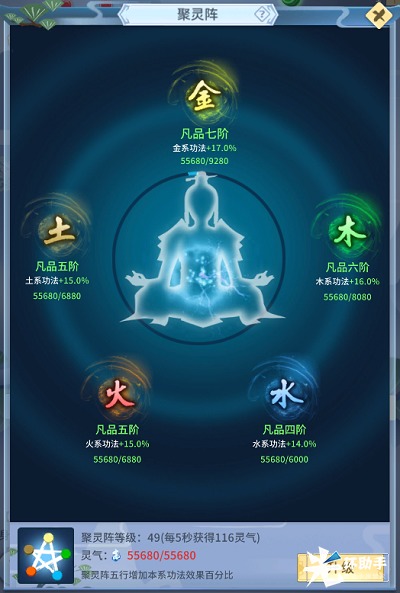 五行相生相克,在每位仙友身体内也存在的五行灵根,在聚灵阵中通过灵气的滋养而成长,最终影响到各位仙友学习不同属性功法所带来的收益