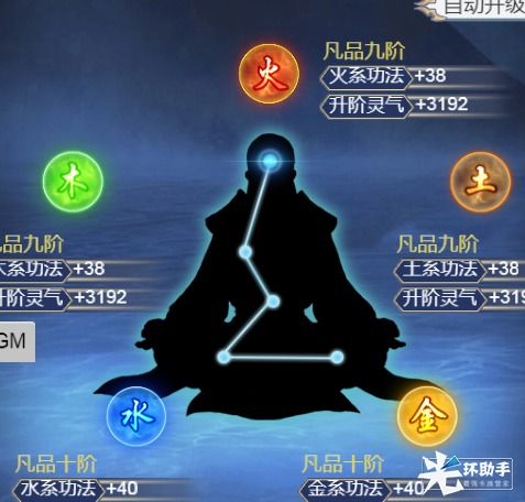 灵根分为金木水火土5种,提升不同属性的灵根等级,能直接提升修士五行功法的属性值。提升灵根等级,需要消耗一定的灵气,而灵气则从灵池中产出。