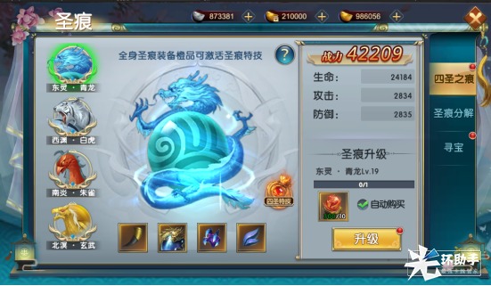 2.当每个部位镶嵌的装备品质均为橙色品质时,可激活对应的四圣特技,四圣特技满级50级,升级使用圣痕之魂升级,圣痕之魂可通过分解圣痕装备获得。