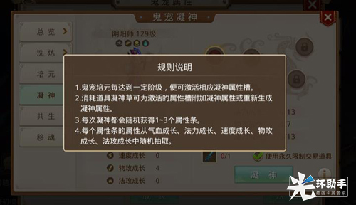 鬼宠凝神通过消耗凝神草附加或者洗练鬼宠属性。凝神属性槽共五个,需要培元分别达到一阶,三阶,五阶,七阶,九阶来开启对应的属性槽。