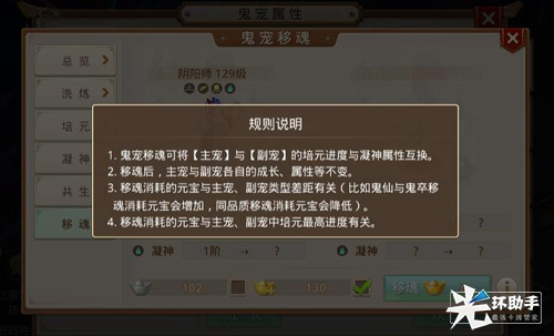 当获得新的鬼宠时,可将已培养的鬼宠培元进度和凝神属性进行转移。但两只鬼宠进行移魂后,只互换鬼宠培元进度和凝神属性,各自的等级、成长、属性等均不发生改变。鬼宠等级可以直接用经验丹提升。