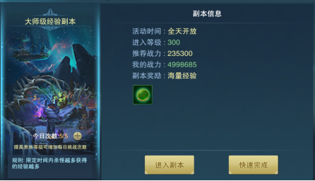 经验副本根据玩家等级段分为不同难度,限定时间内玩家击杀的怪物越多,获得的经验也就越多,这对于快速冲击的玩家是每日必做的任务,但要记得每日有挑战次数限制,不能浪费机会。当然如果觉得次数不够的小伙伴,还可以通过购买次数,再次进行冒险。