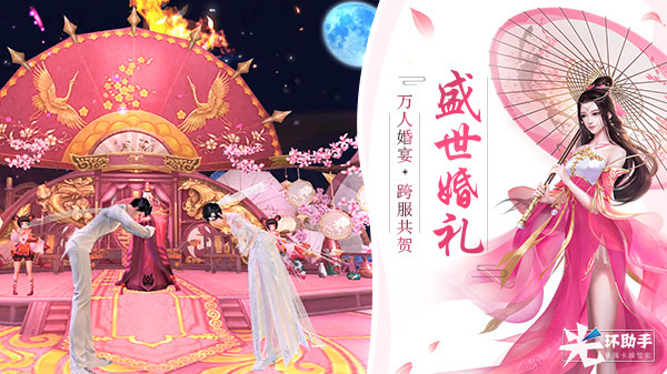 盛大的跨服婚礼,还有堵门、抢绣球和拼酒等有趣玩法,华丽非凡,羡煞三界!
