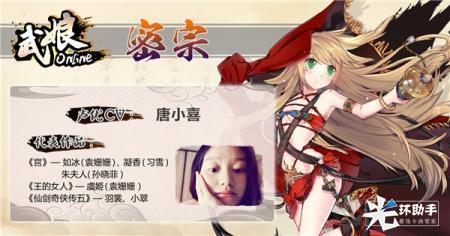 唐小喜,此次在《武娘》游戏中为丐帮、太极、密宗配音。曾为《仙剑奇侠传四》璇玑、《仙剑奇侠传五》羽裳、小翠配音。其影视代表作品有电视剧《宫》中为如冰袁姗姗、凝香习雪、朱夫人孙晓菲配音,《王的女人》中为虞姬袁姗姗配音。