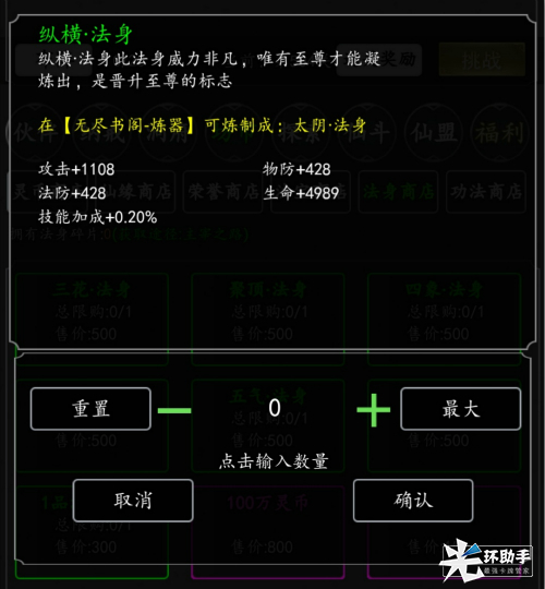 法身可以通过无尽书阁炼器炼制出高等级的法身,等级越高的法身,基础属性越高。