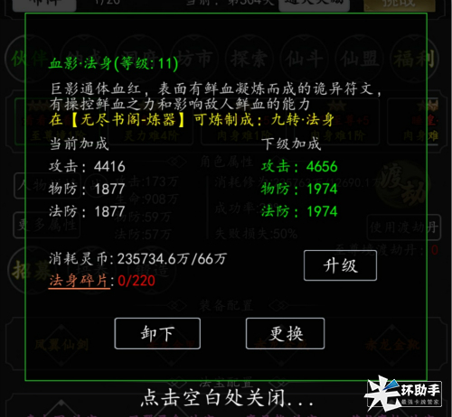 法身可以通过升级进一步强化数值,升级法身需要消耗一定数量的法身碎片,佩戴法身后,法身本身数值属性可以直接增加到对应角色上。