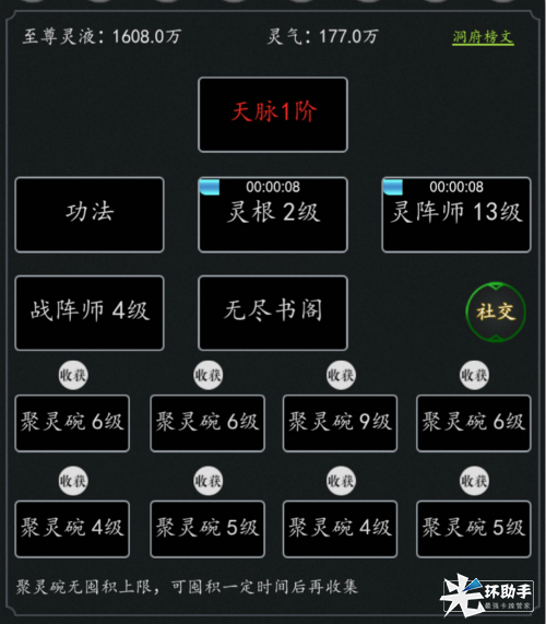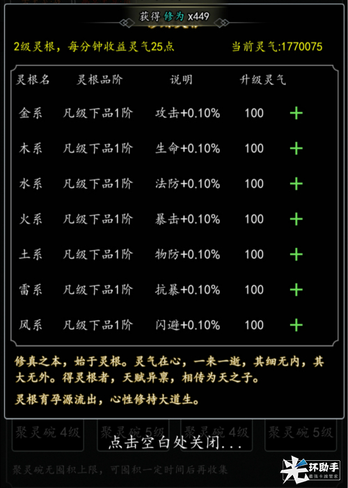 灵根每间隔一段时间可以收获灵气,灵根等级越高收益越大,进入灵根后,可以消耗灵气提升主角的百分比属性加成