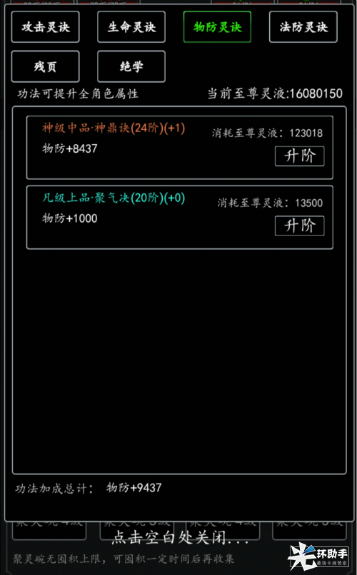 在商店购买功法,在背包使用后可以提升全角色属性,升级强化功法需要消耗一定数量的至尊灵液。