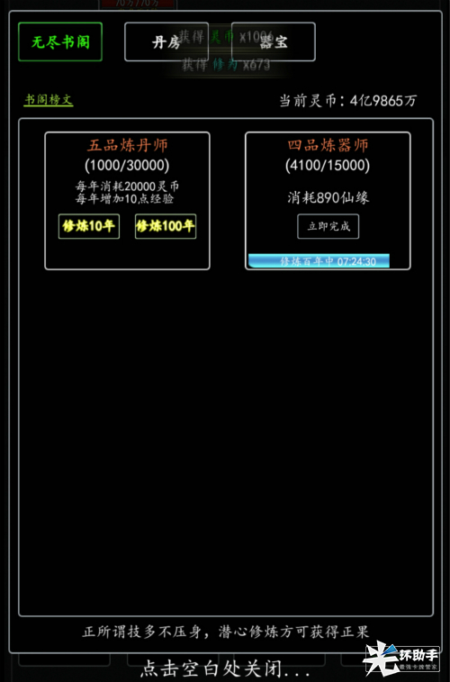 无尽书阁可以提升炼丹和炼器等级。丹房可以修仙丹药,品阶越高,炼丹成功率越高。器宝可以炼器,产出更高级别的武器跟法宝,炼器品阶越高,炼器产出成功率越高。