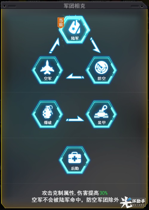《绝地装甲》游戏内,目前共有六个军团可供玩家进行选择,如上图所示,各个军团都有着自己独特的战略位置。每个玩家最初接触的都是最上方的环形克制的三个军团——陆军军团、防空军团、空军军团这三个军团相互克制,当军团攻击被克制的军团时,会增加30%的军团伤害。还会触发独特的克制伤害。