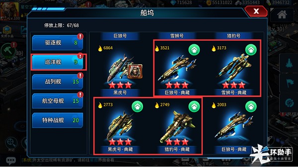 巡洋舰主要拥有必定命中的能力,适合中远距离战斗,与驱逐舰战斗有克制优势,可以对射程范围内的目标发射导弹。巡洋舰一共有八艘战舰,4个普通战舰和4个典藏战舰,巡洋舰的普通和典藏区别不大,下面我们重点介绍一下战舰;