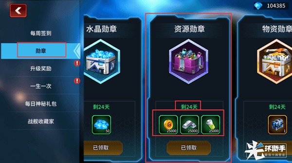 第一,是我们必买的勋章,这里每天可以领取到的物资是性价比最高的一个勋章,每天可以获取到各2.5W的资源;
