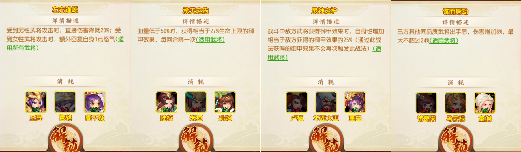 如图,具体的四个新战法特性以及解锁需要的金将如下: