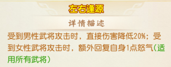 虽然只针对男性武将的伤害降低,但是收益却不低,实际环境下超过80%的阵容都是男将做主力输出,而女将能够作为输出的只有周姬、孙尚香和董白这三个了,并且使用率不是很高;此外,战法附带的回怒效果在对战有小乔周姬的吴国时也比较舒服,给主力输出带丢在前排一回合理想状况下可以回3点怒气,可以更有把握的使用司马懿锦囊,避免二次出手续航不足的问题!