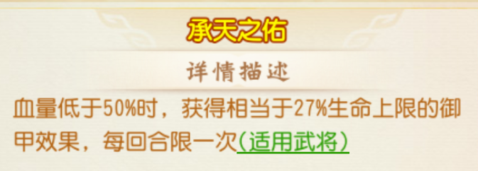 总结来看,承天之佑这个金战法防御性收益并不高,虽然有防御作用,但是投入代价太大,属于低性价比的金战法,资源不是非常充裕的时候,不推荐入手!