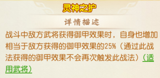 同样是回复御甲的战法,不过这个战法比较特殊,回复的量取决于对手,简单说就是对手回的多,跟着回的就多!在武将适用性上跟承天之佑一样,不适应于肉盾武将,剩下的武将均适用。我们通过一个简单的计算来体会一下这个战法的收益:倘若对手的治疗将有“连理并蒂”战法,那么一个技能附加的御甲是15% x 6 = 90%;加上满星的神玄武技能的回御甲是18% x 3 = 54%,那么最终得出灵神之护的收益刚好是54%生命上限的御甲,当然具体的御甲数值根据不同武将的生命值差异肯定有细微的差距,不够佩戴该战法的武将本身生命值也不高的话,那么收益就只会更高!
