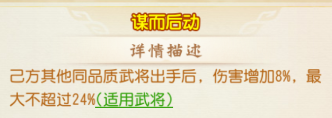 本次唯一的输出型战法,仅适用于输出定位的武将,战法特性跟橙色战法中的激将和怒火十分相似,最终的伤害加成都是24%,谋而后动强的地方就在于他叠满伤害的速度比较快,在合适的阵容中第一回合佩戴武将出手前就可以叠满24%的伤害,所以可以直接把它初步理解为一个伤害加成24%的战法,倘若是这样去看的话,那么强度还是可以的,毕竟初始24%的伤害加成收益的确不错,但是对阵容的要求毕竟高,这里就涉及到“同品质武将”这个概念了,橙将界限升红后就算红色品质的了,而红将界限升金后就算金色品质的了,倘若你的阵容是1金+5红的搭配,并且主力输出是金将,那么这个战法就没法给金将去用了,当然纯红色品质武将的阵容,或者多金色品质武将的阵容,就能很好的发挥这个战法的特性!